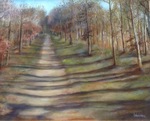 2019Een bospaadje met gevarieerde begroeiing aan beide kanten, met uitzicht op het licht. Lijnen die mijn oog waarneemt breng ik het liefst zoveel mogelijk als zachte kleurovergangen aan die door lichtval en schaduw vloeiend worden gemaakt.